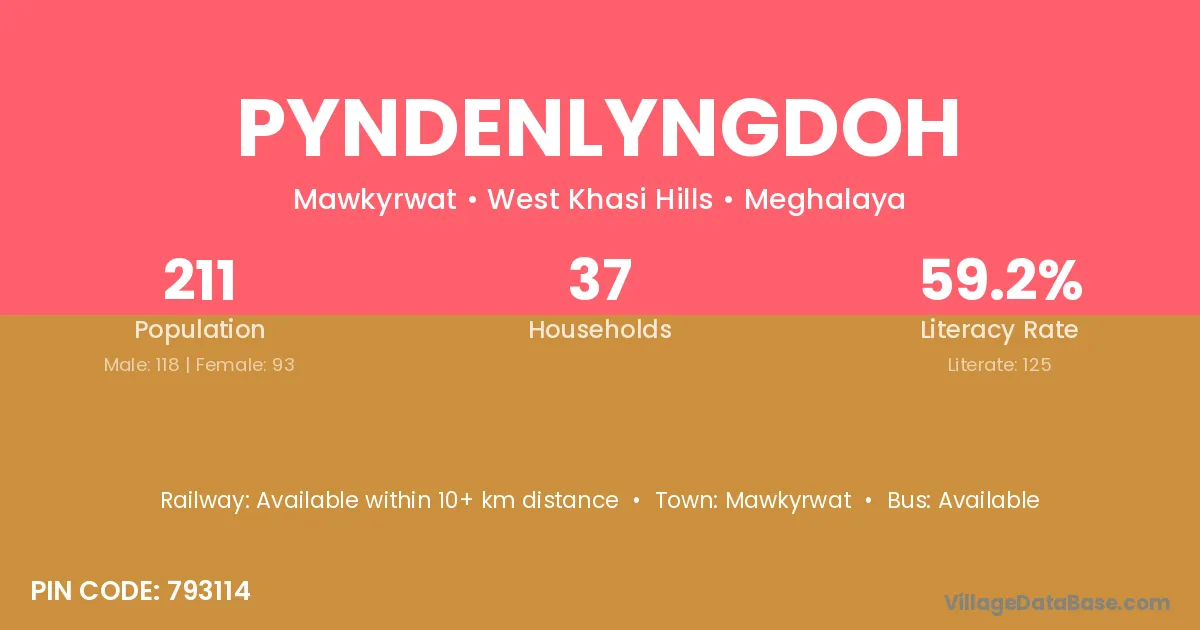 Pyndenlyngdoh village has a total population of 211 people, of which 118 are males and 93 are females.