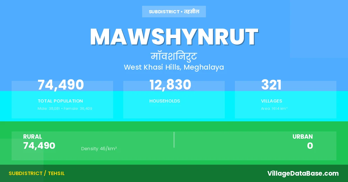 According to the 2011 census The total area of Mawshynrut Subdivision is 1614 km², with a population of 74490 people. The population density is 46 inhabitants per square kilometre, and there are approximately 12830 houses in the sub district.