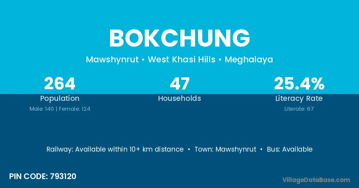 Bokchung village has a total population of 264 people, of which 140 are males and 124 are females.
