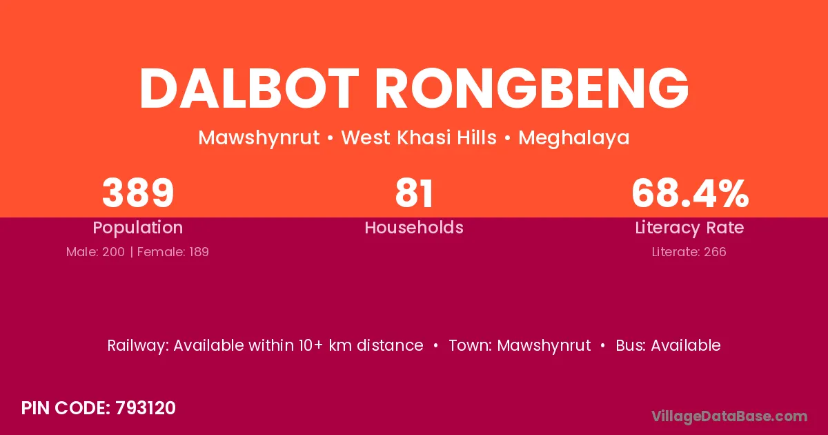 Dalbot Rongbeng village has a total population of 389 people, of which 200 are males and 189 are females.