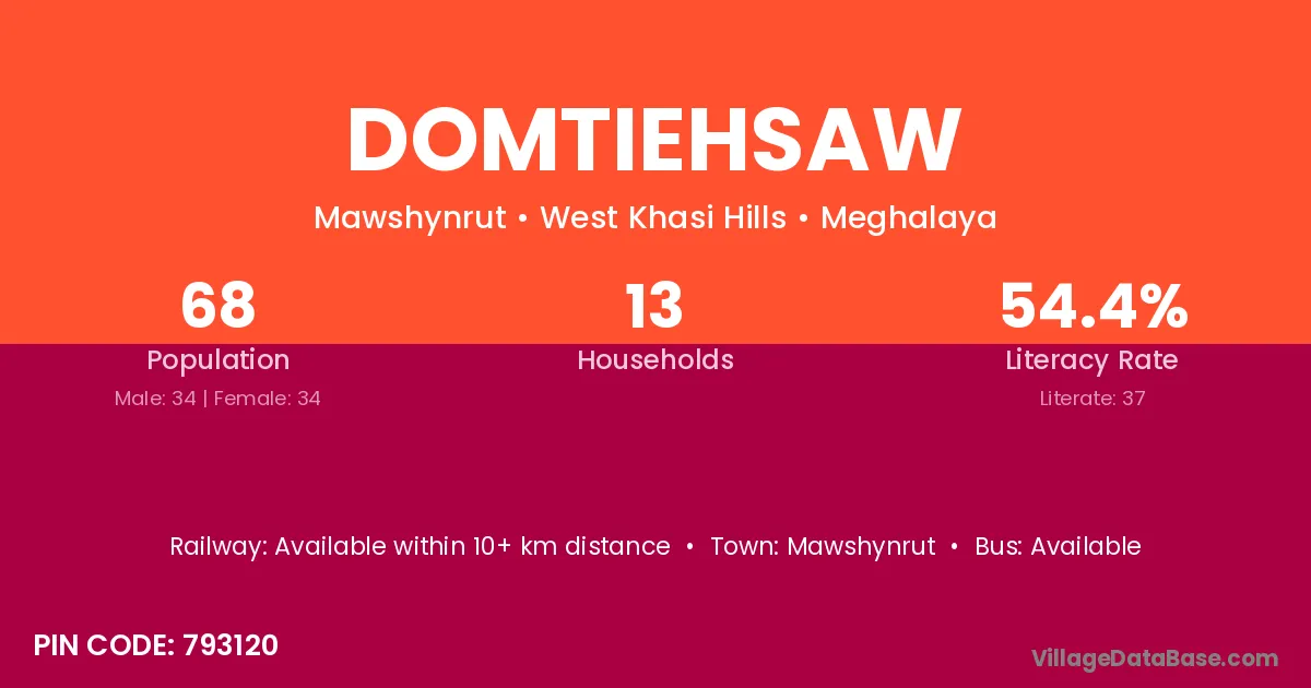 Domtiehsaw village has a total population of 68 people, of which 34 are males and 34 are females.