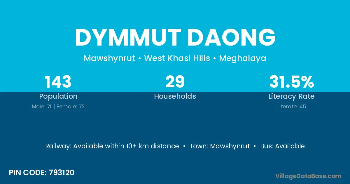 Dymmut Daong village has a total population of 143 people, of which 71 are males and 72 are females.