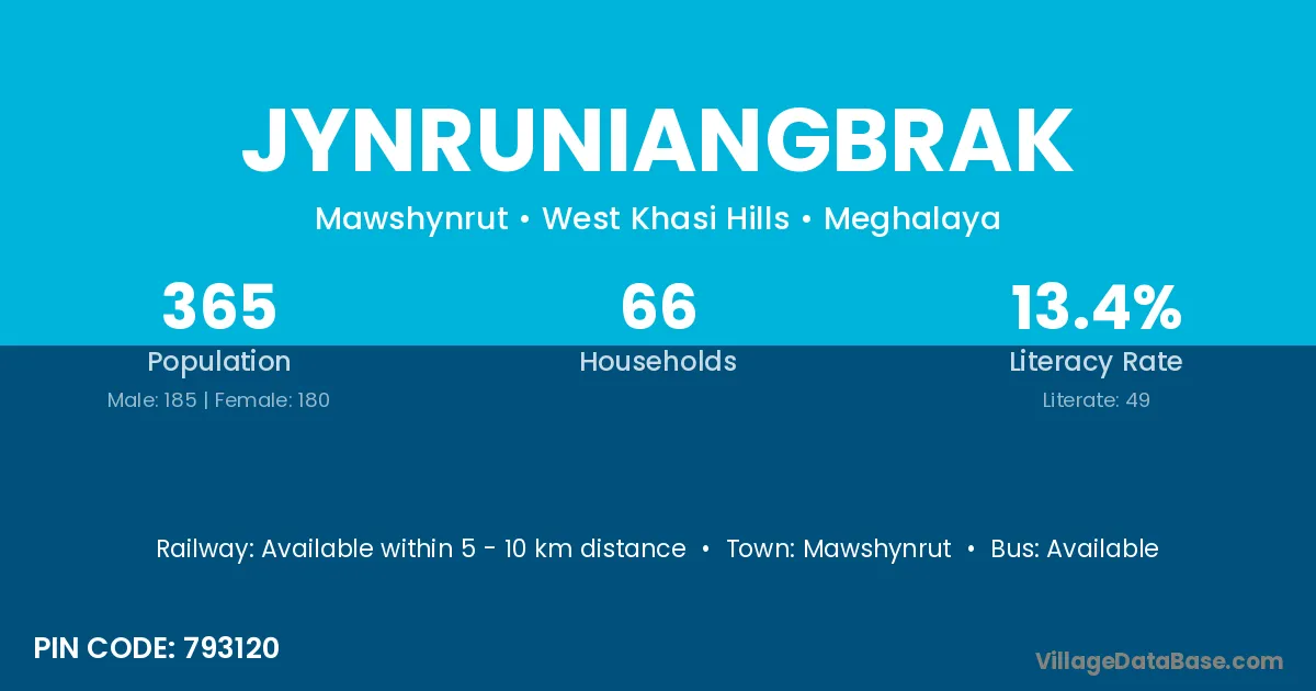 Jynruniangbrak village has a total population of 365 people, of which 185 are males and 180 are females.