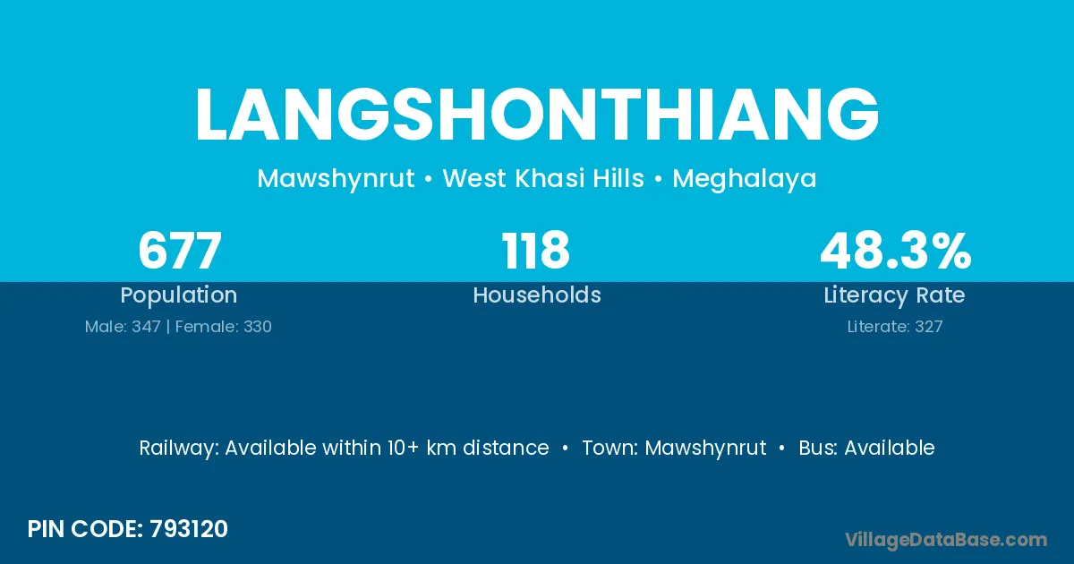 Langshonthiang village has a total population of 677 people, of which 347 are males and 330 are females.