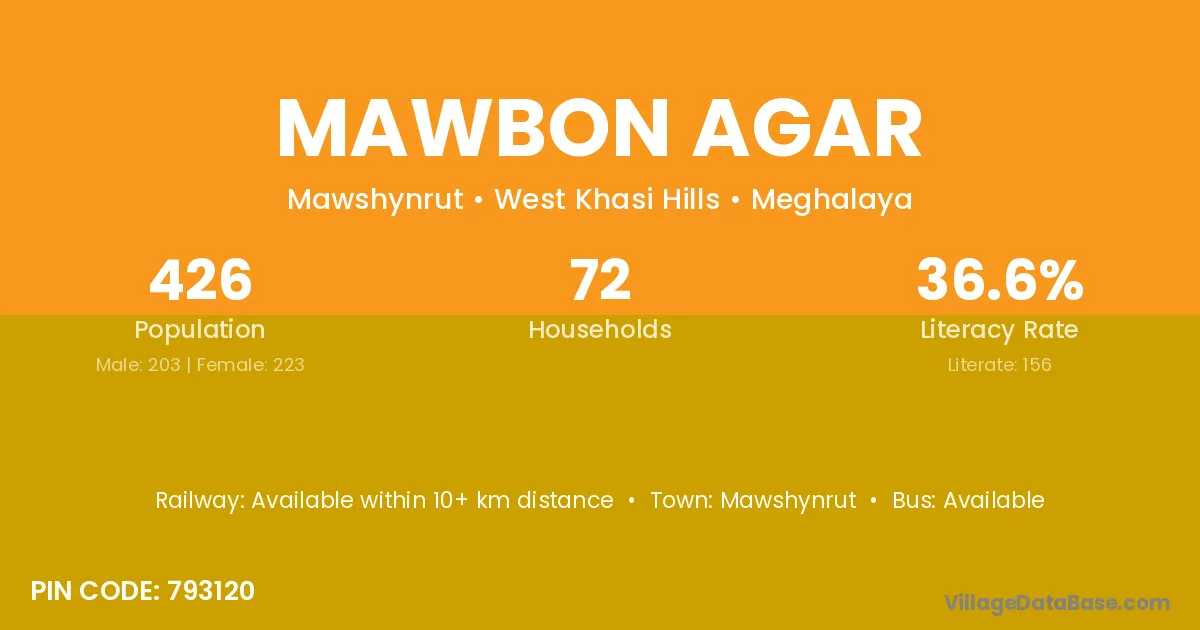 Mawbon Agar village has a total population of 426 people, of which 203 are males and 223 are females.
