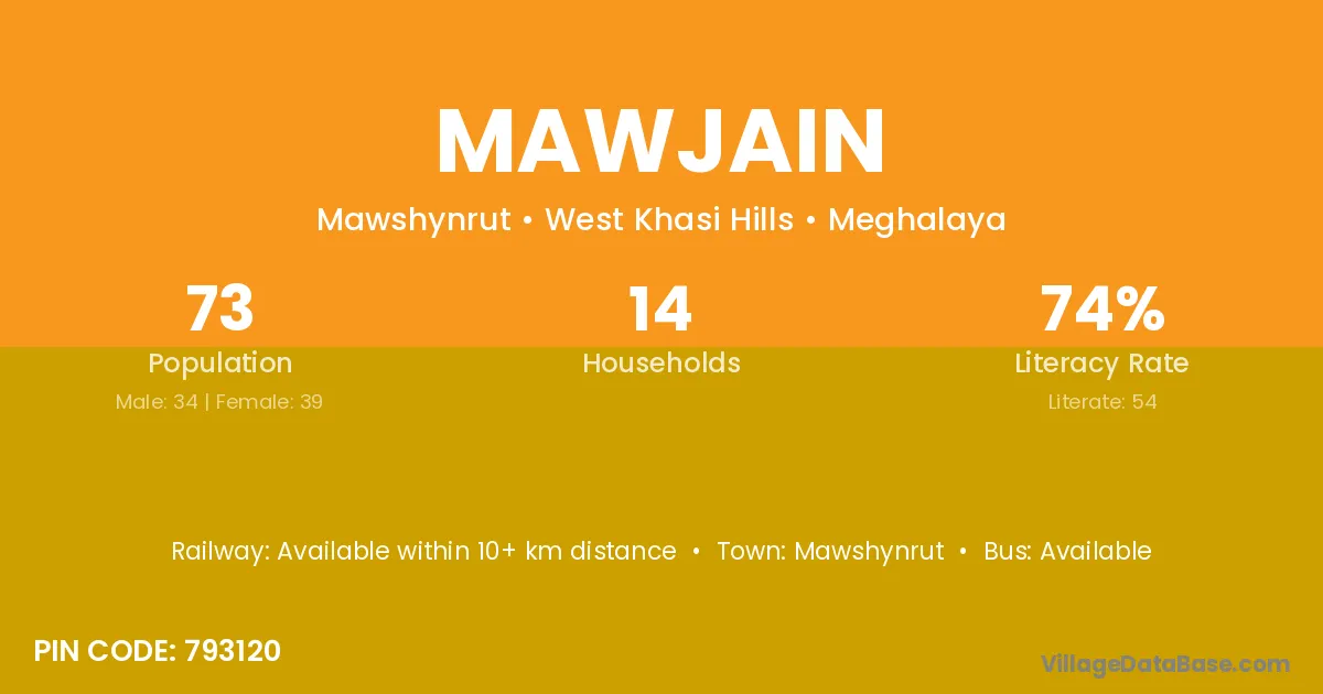 Mawjain village has a total population of 73 people, of which 34 are males and 39 are females.