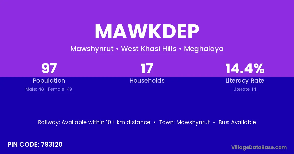 Mawkdep village has a total population of 97 people, of which 48 are males and 49 are females.