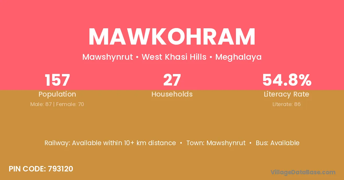 Mawkohram village has a total population of 157 people, of which 87 are males and 70 are females.