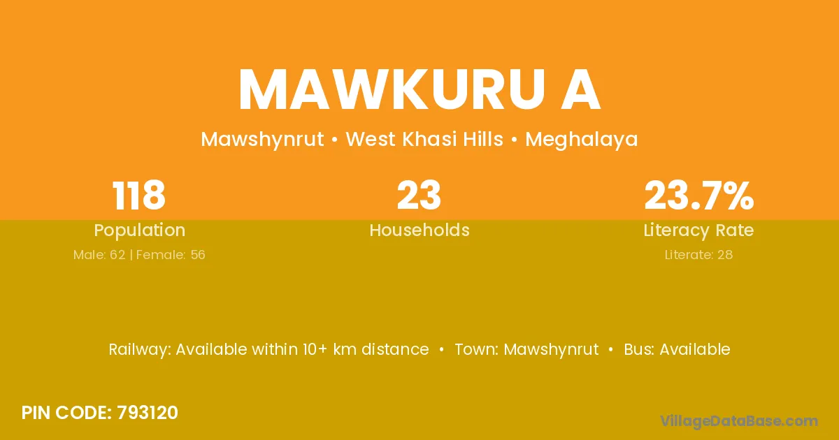 Mawkuru A village has a total population of 118 people, of which 62 are males and 56 are females.