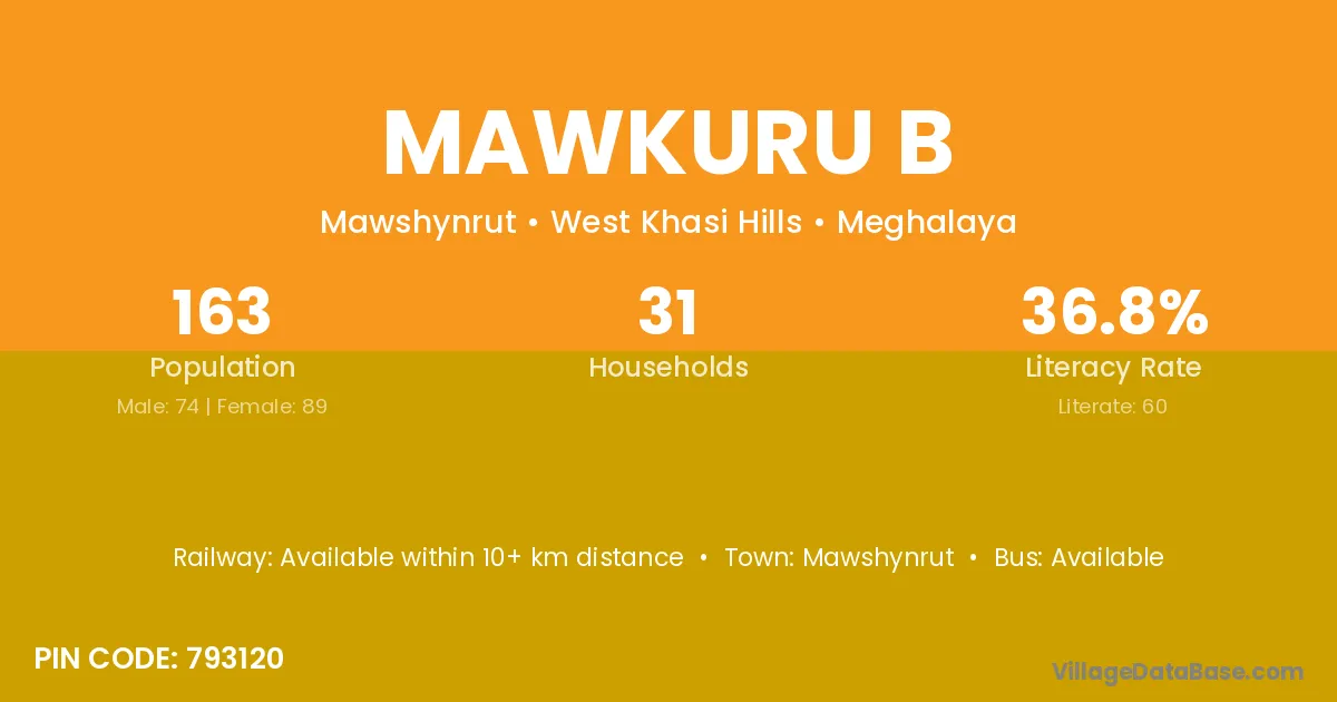 Mawkuru B village has a total population of 163 people, of which 74 are males and 89 are females.