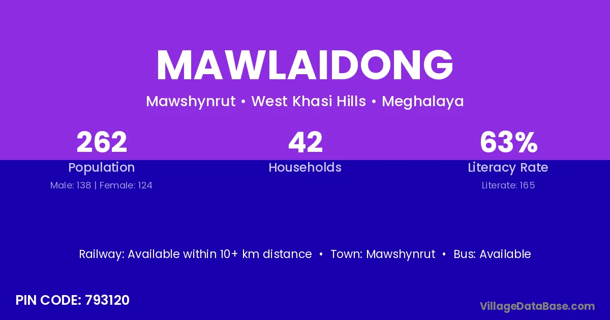 Mawlaidong village has a total population of 262 people, of which 138 are males and 124 are females.