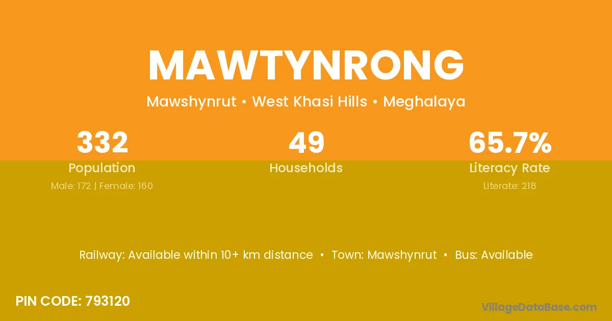 Mawtynrong village has a total population of 332 people, of which 172 are males and 160 are females.