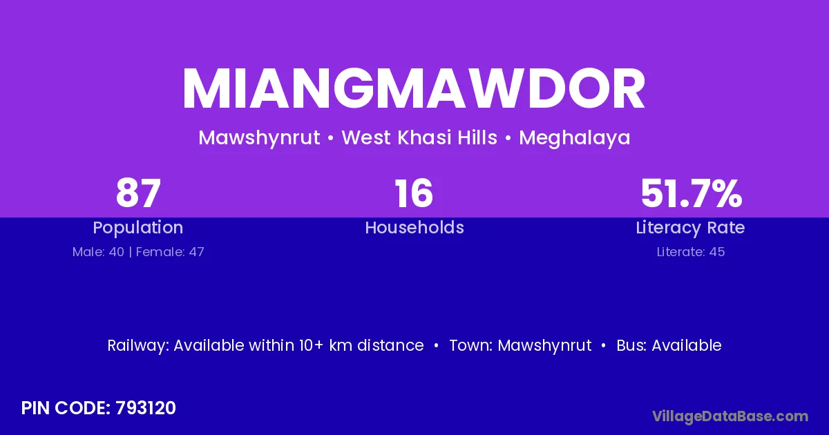 Miangmawdor village has a total population of 87 people, of which 40 are males and 47 are females.