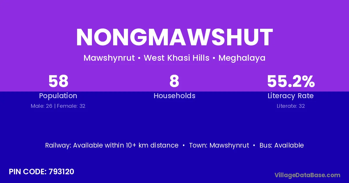 Nongmawshut village has a total population of 58 people, of which 26 are males and 32 are females.