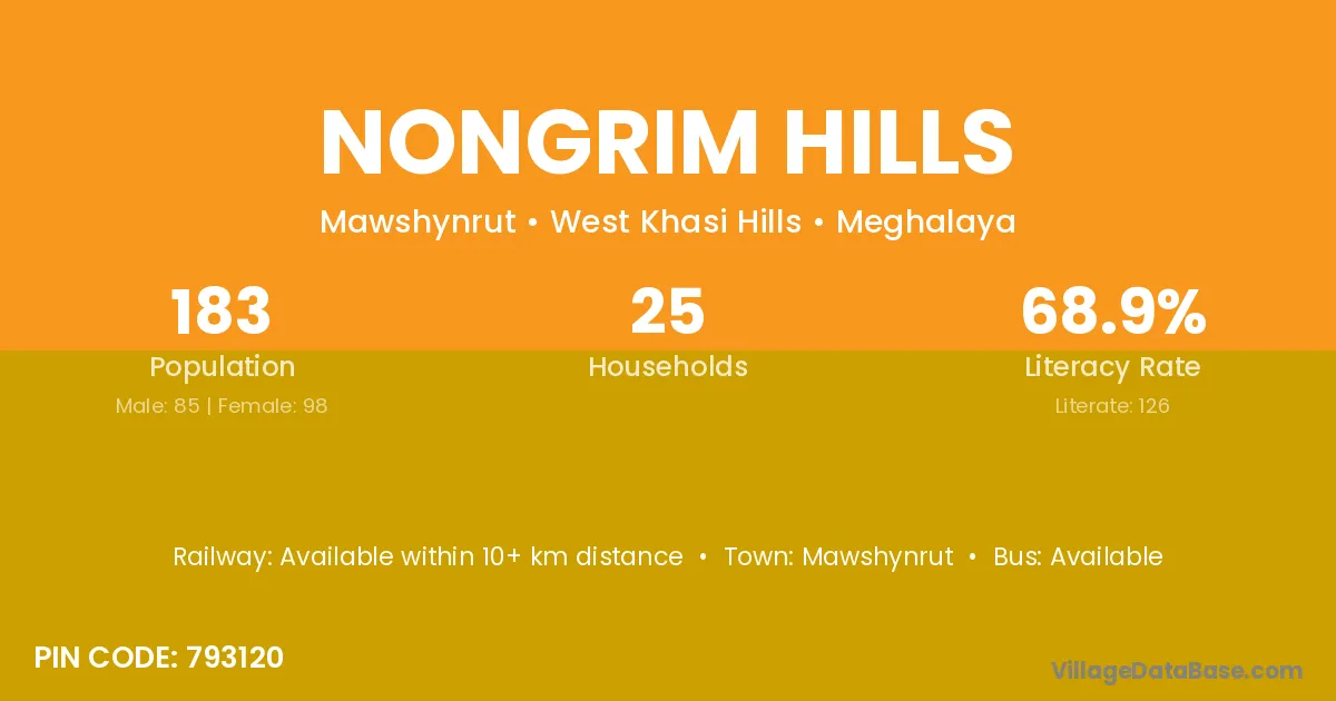 Nongrim Hills village has a total population of 183 people, of which 85 are males and 98 are females.