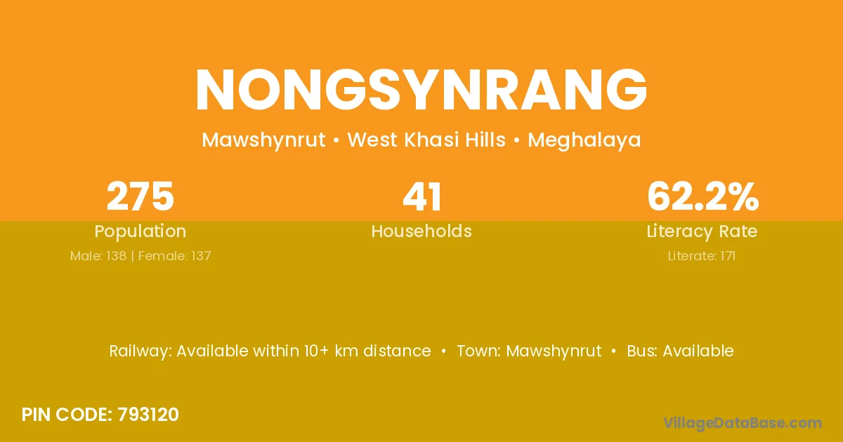Nongsynrang village has a total population of 275 people, of which 138 are males and 137 are females.