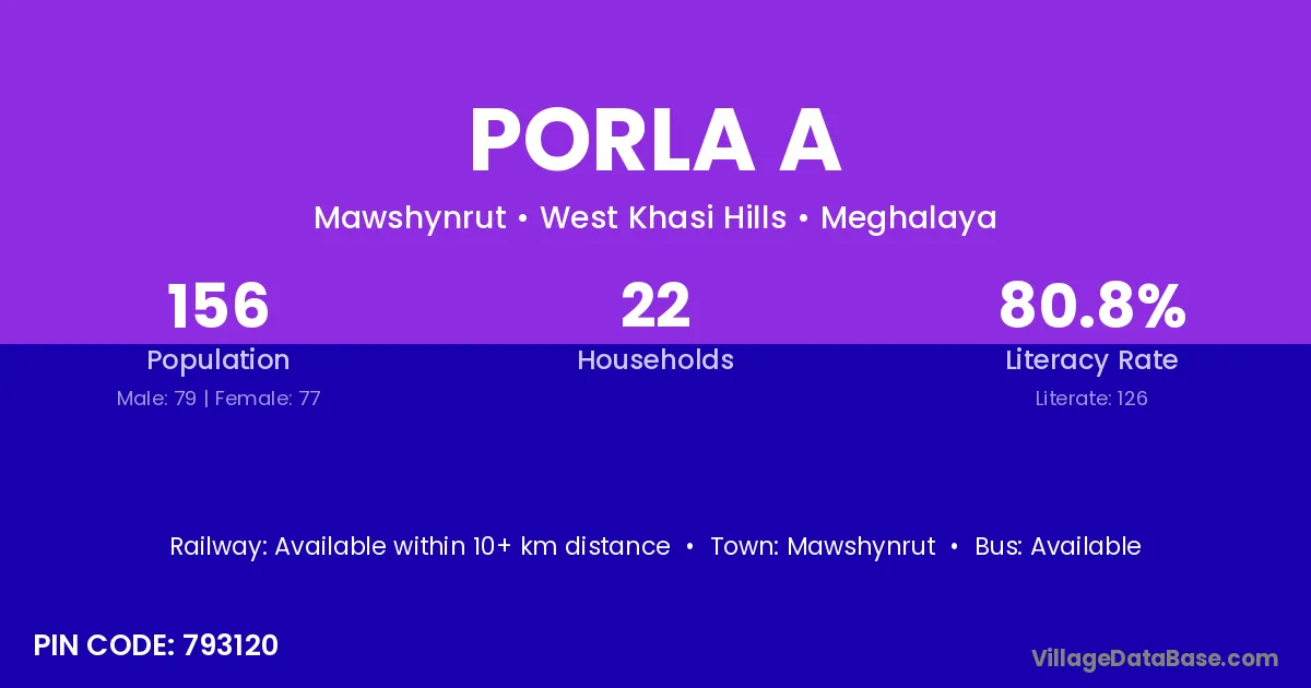 Porla A village has a total population of 156 people, of which 79 are males and 77 are females.