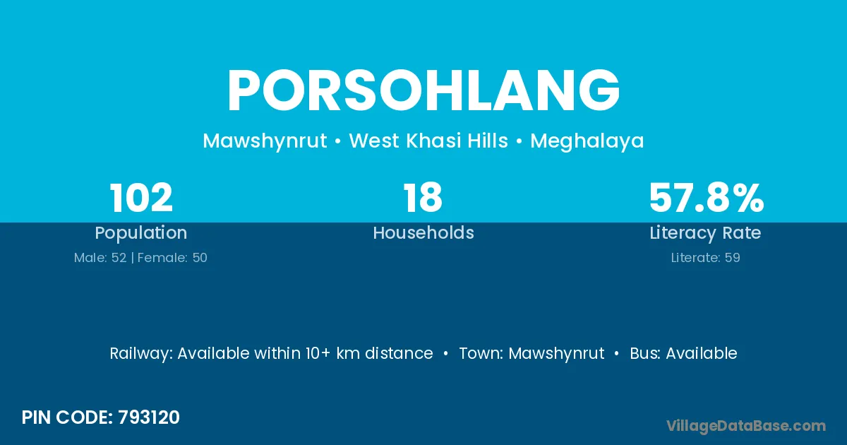 Porsohlang village has a total population of 102 people, of which 52 are males and 50 are females.