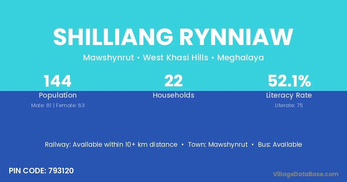 Shilliang Rynniaw village has a total population of 144 people, of which 81 are males and 63 are females.