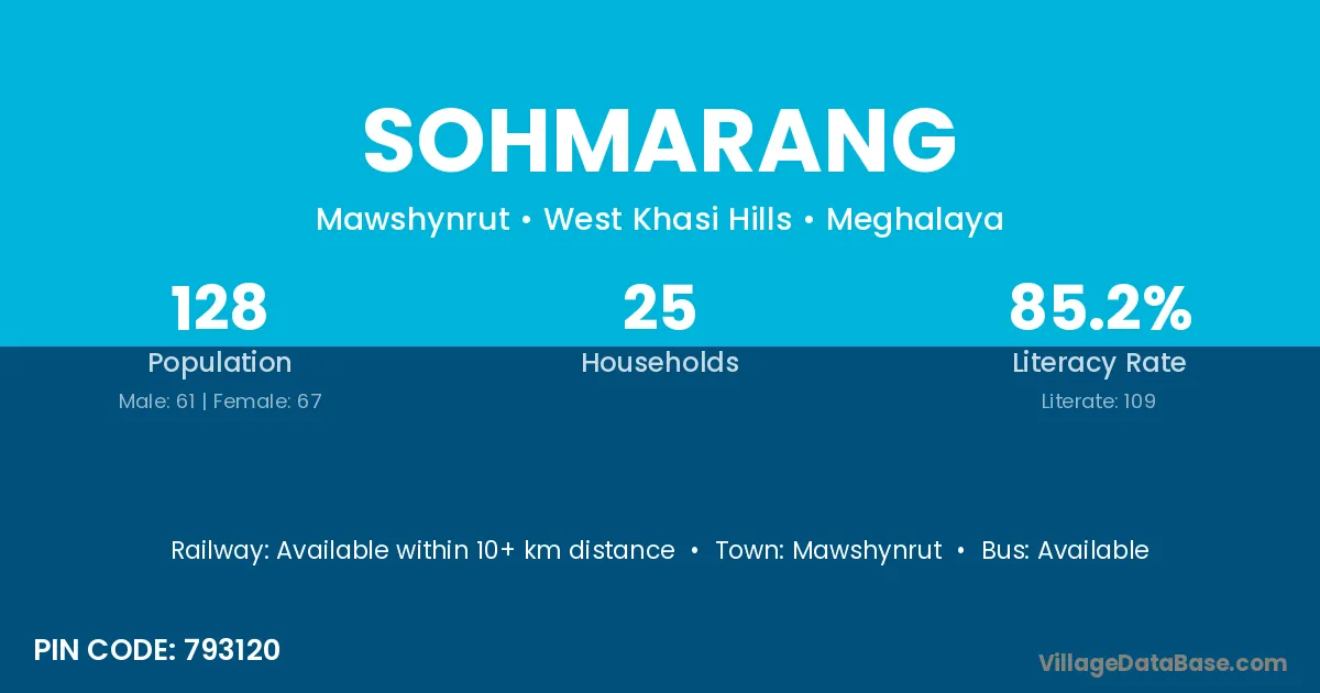 Sohmarang village has a total population of 128 people, of which 61 are males and 67 are females.