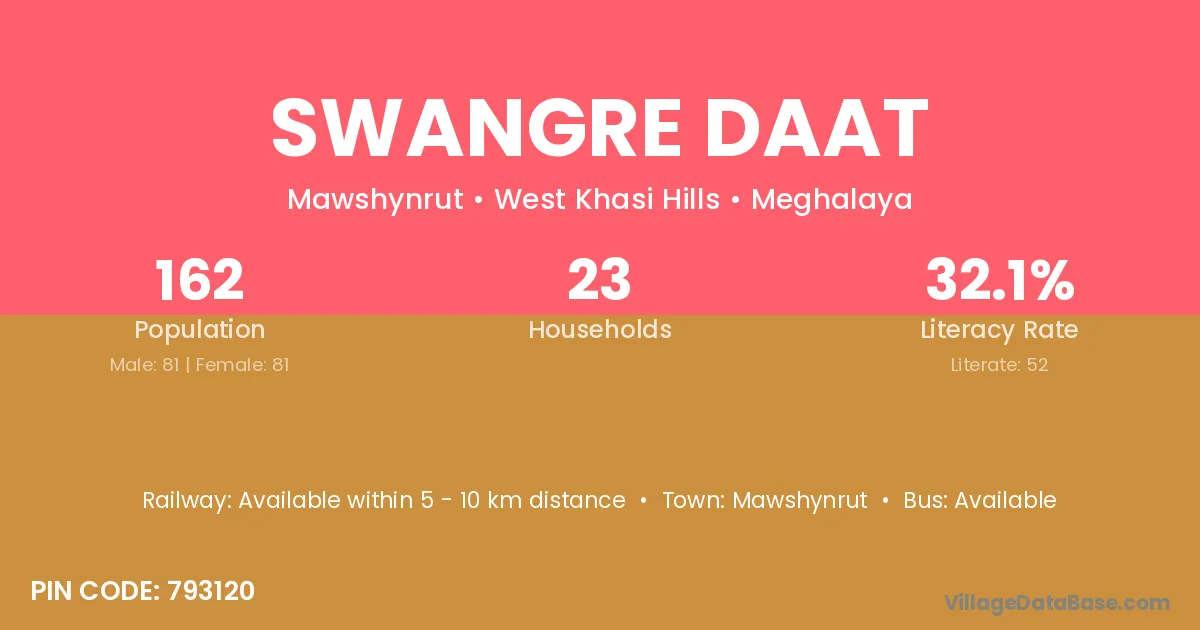 Swangre Daat village has a total population of 162 people, of which 81 are males and 81 are females.