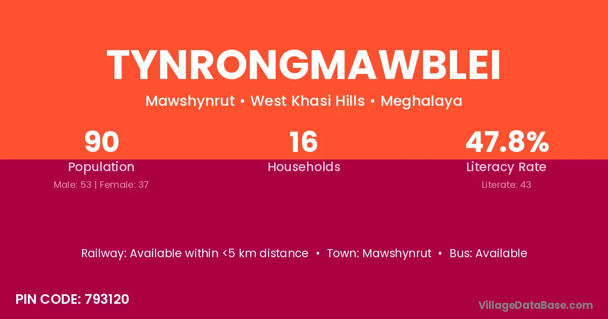 Tynrongmawblei village has a total population of 90 people, of which 53 are males and 37 are females.