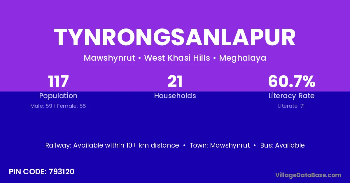 Tynrongsanlapur village has a total population of 117 people, of which 59 are males and 58 are females.