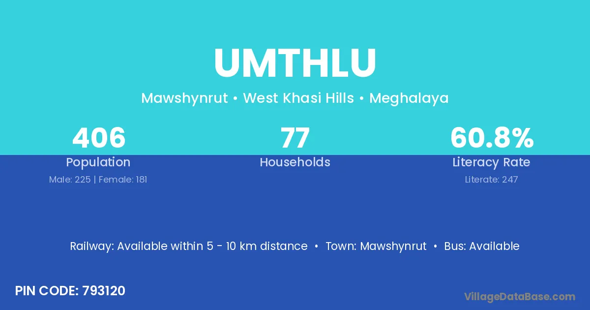 The literacy rate of Umthlu village is 60.84%. Male literacy stands at 60.00% and female literacy at 61.88%.