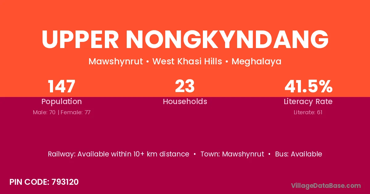 Upper Nongkyndang village has a total population of 147 people, of which 70 are males and 77 are females.