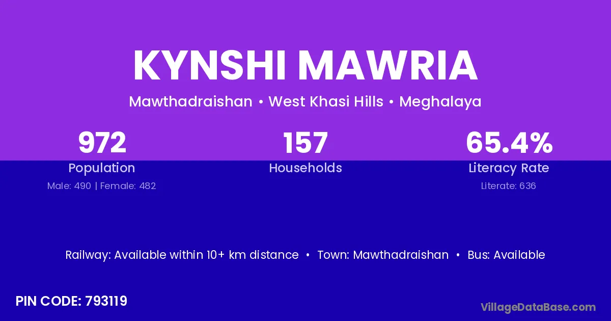 Kynshi Mawria village has a total population of 972 people, of which 490 are males and 482 are females.