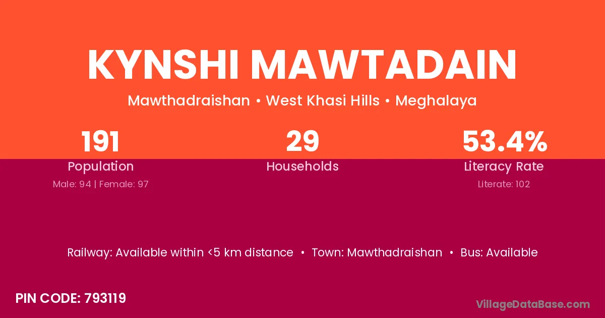 Kynshi Mawtadain village has a total population of 191 people, of which 94 are males and 97 are females.