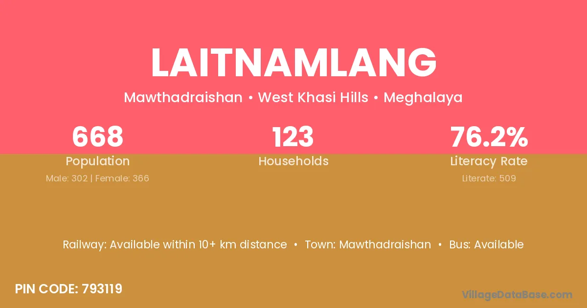 Laitnamlang village has a total population of 668 people, of which 302 are males and 366 are females.