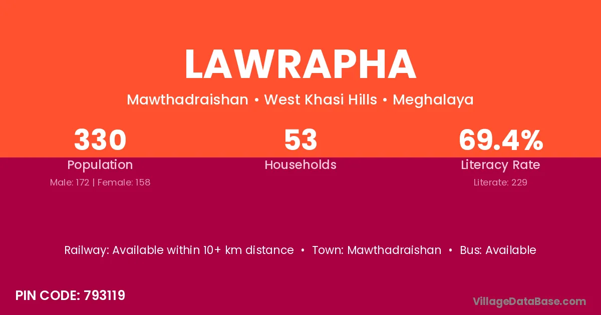 Lawrapha village has a total population of 330 people, of which 172 are males and 158 are females.
