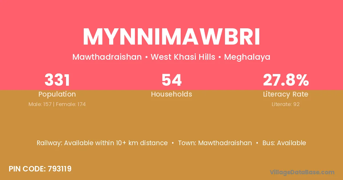 Mynnimawbri village has a total population of 331 people, of which 157 are males and 174 are females.