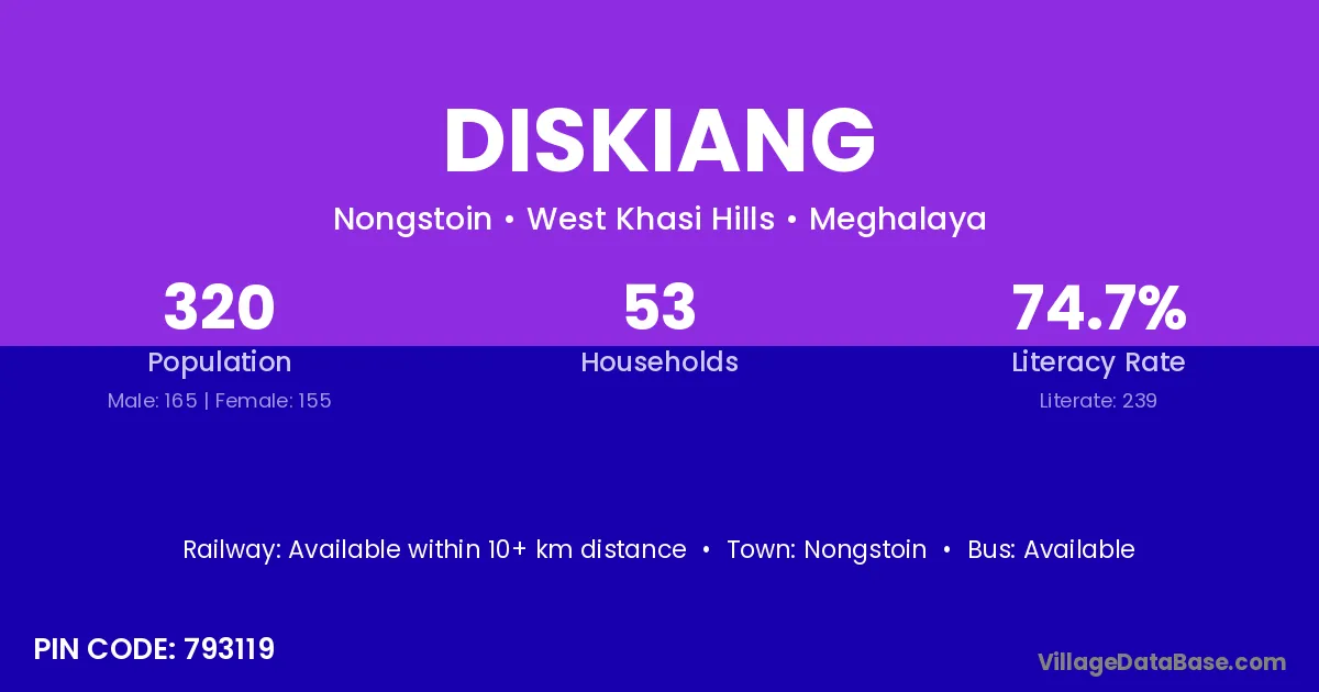 Diskiang village has a total population of 320 people, of which 165 are males and 155 are females.