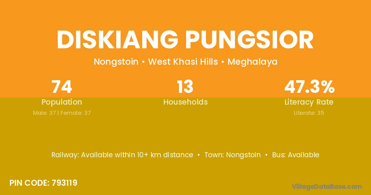 Diskiang Pungsior village has a total population of 74 people, of which 37 are males and 37 are females.