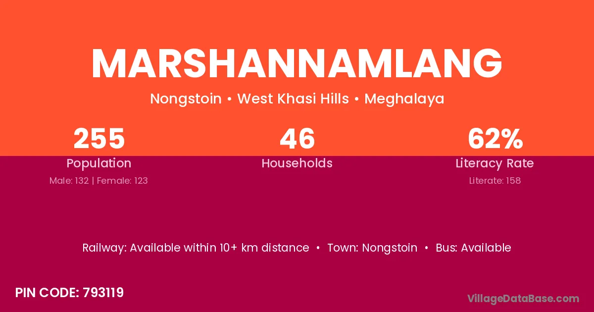 Marshannamlang village has a total population of 255 people, of which 132 are males and 123 are females.