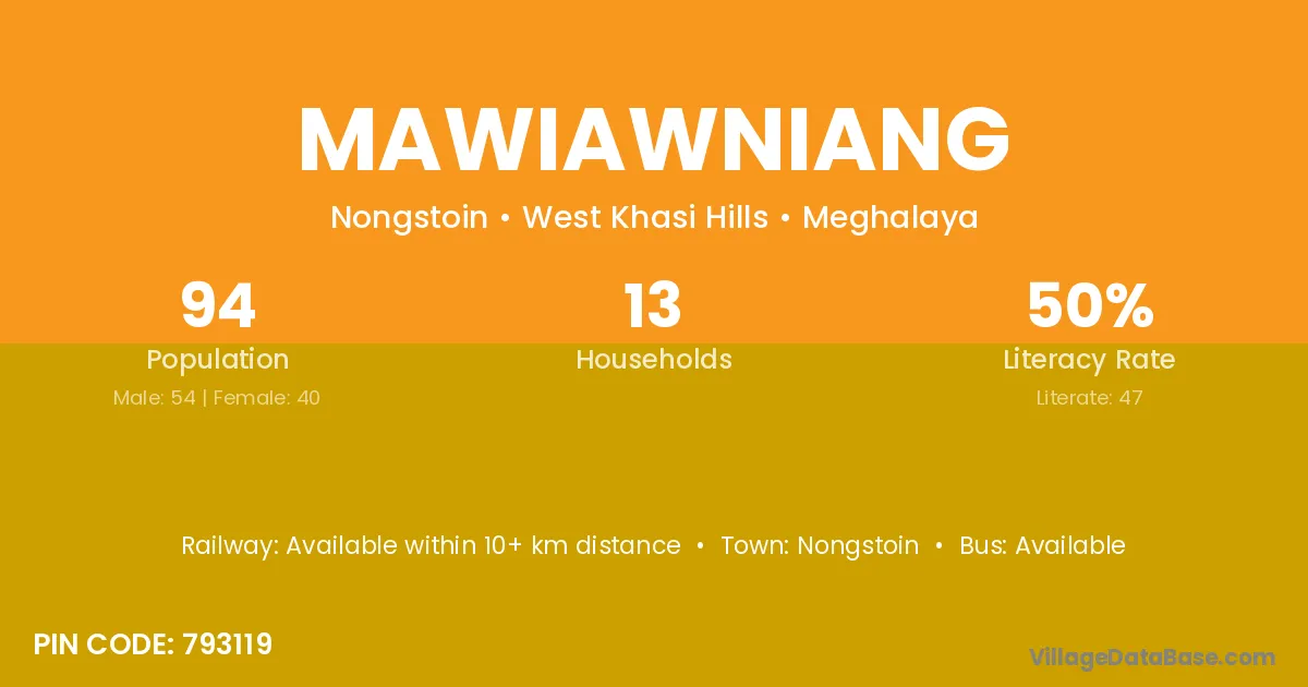 Mawiawniang village has a total population of 94 people, of which 54 are males and 40 are females.