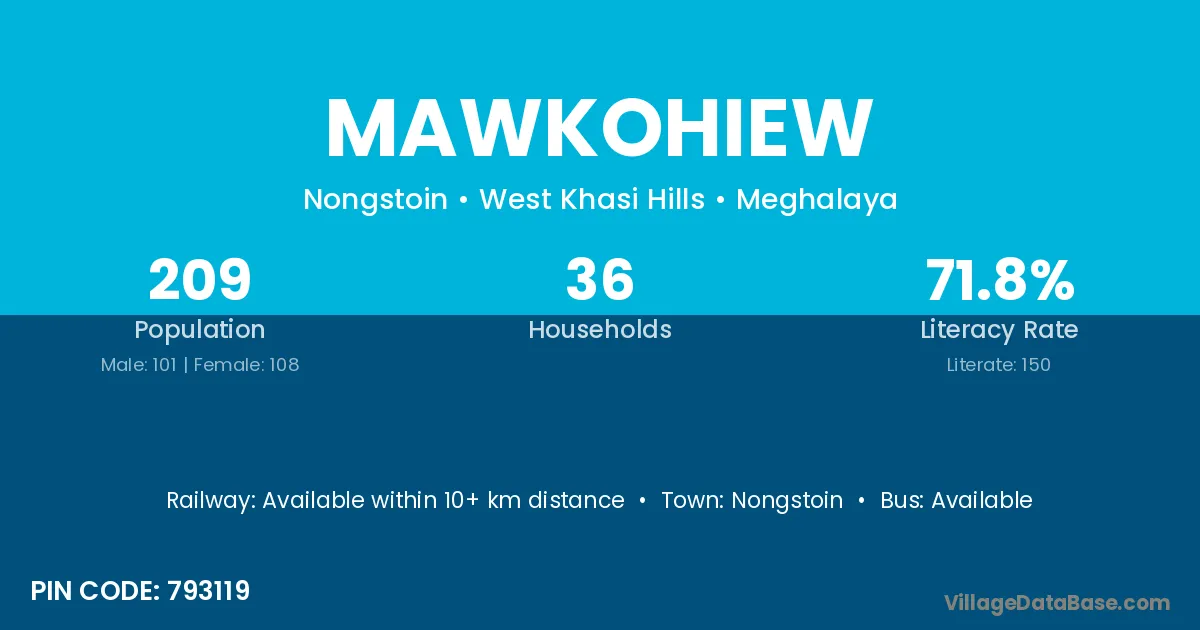 Mawkohiew village has a total population of 209 people, of which 101 are males and 108 are females.