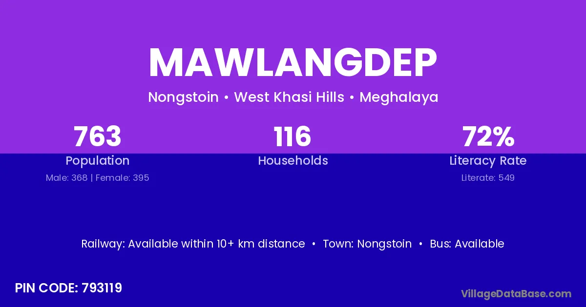 Mawlangdep village has a total population of 763 people, of which 368 are males and 395 are females.