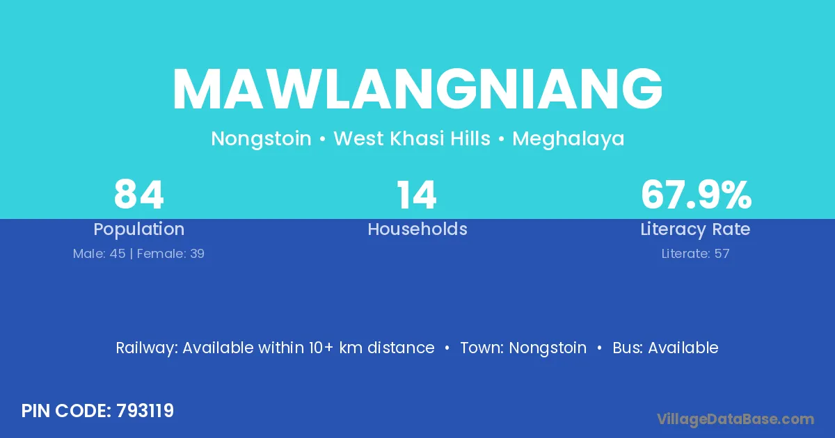 Mawlangniang village has a total population of 84 people, of which 45 are males and 39 are females.
