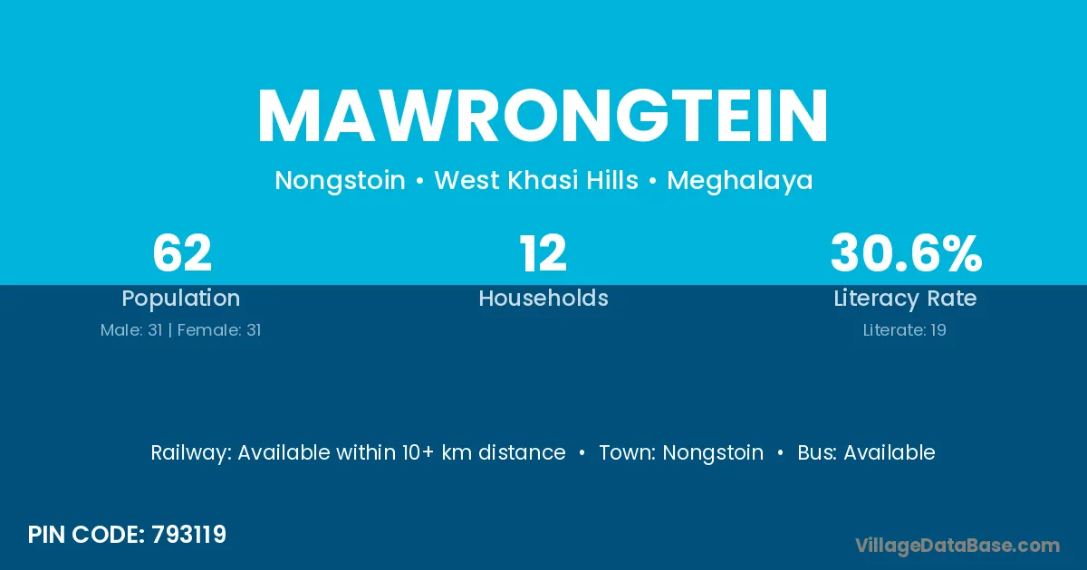 Mawrongtein village has a total population of 62 people, of which 31 are males and 31 are females.