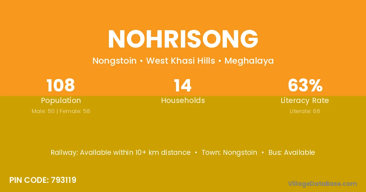 Nohrisong village has a total population of 108 people, of which 50 are males and 58 are females.