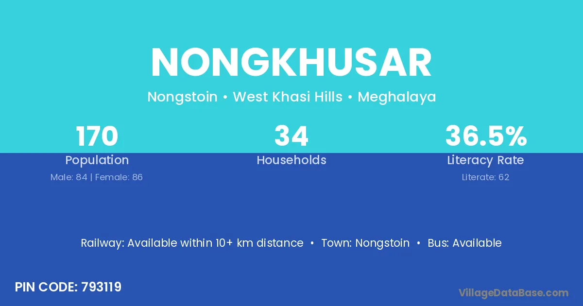 Nongkhusar village has a total population of 170 people, of which 84 are males and 86 are females.