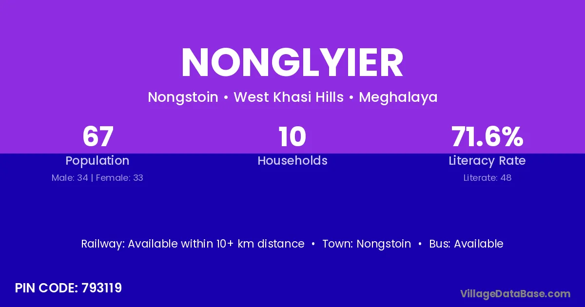 Nonglyier village has a total population of 67 people, of which 34 are males and 33 are females.