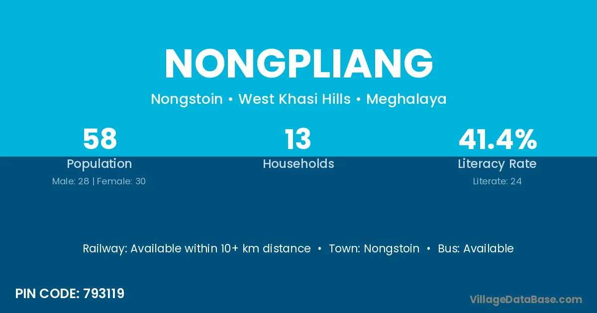 Nongpliang village has a total population of 58 people, of which 28 are males and 30 are females.