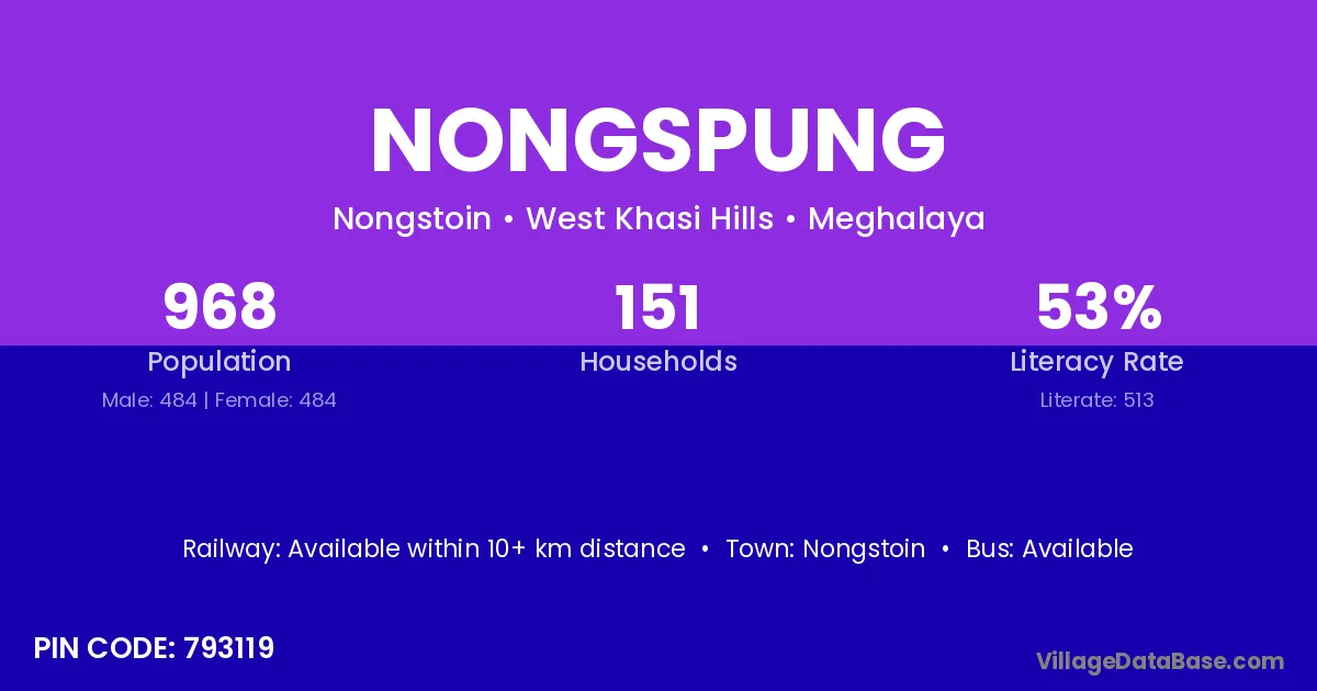 Nongspung village has a total population of 968 people, of which 484 are males and 484 are females.