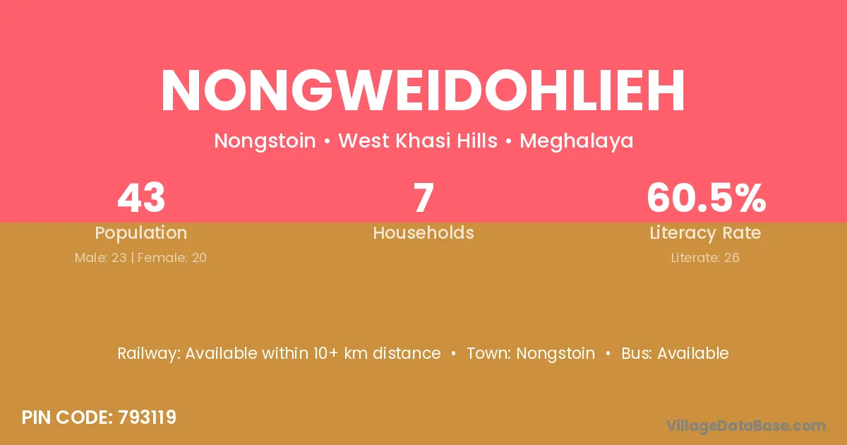 Nongweidohlieh village has a total population of 43 people, of which 23 are males and 20 are females.