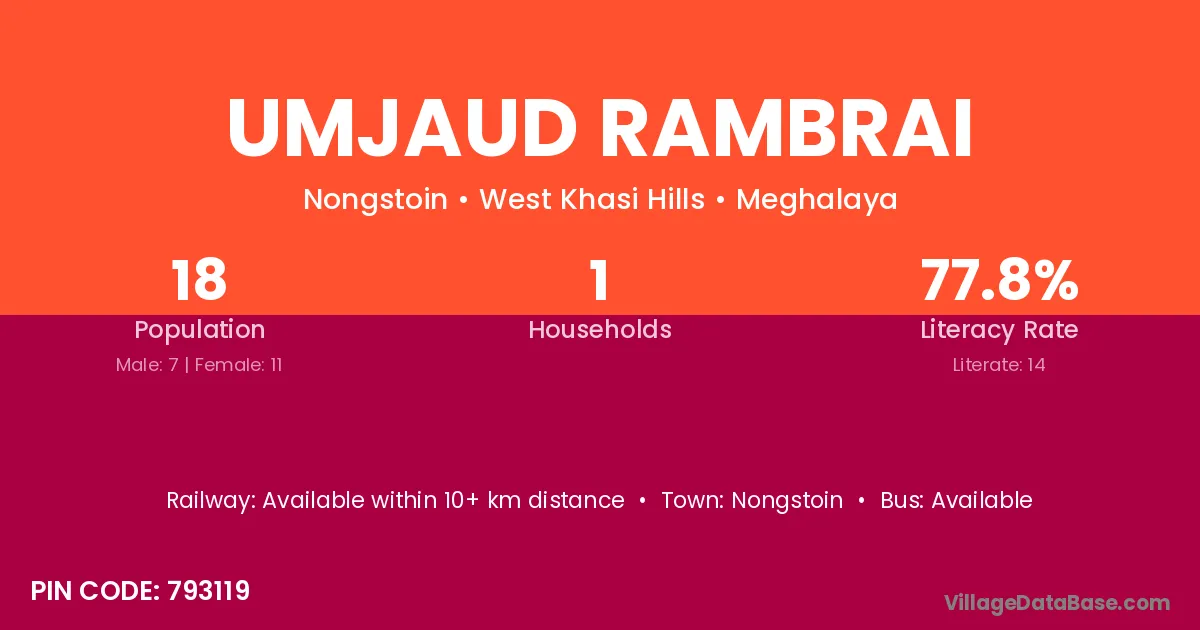 Umjaud Rambrai village has a total population of 18 people, of which 7 are males and 11 are females.