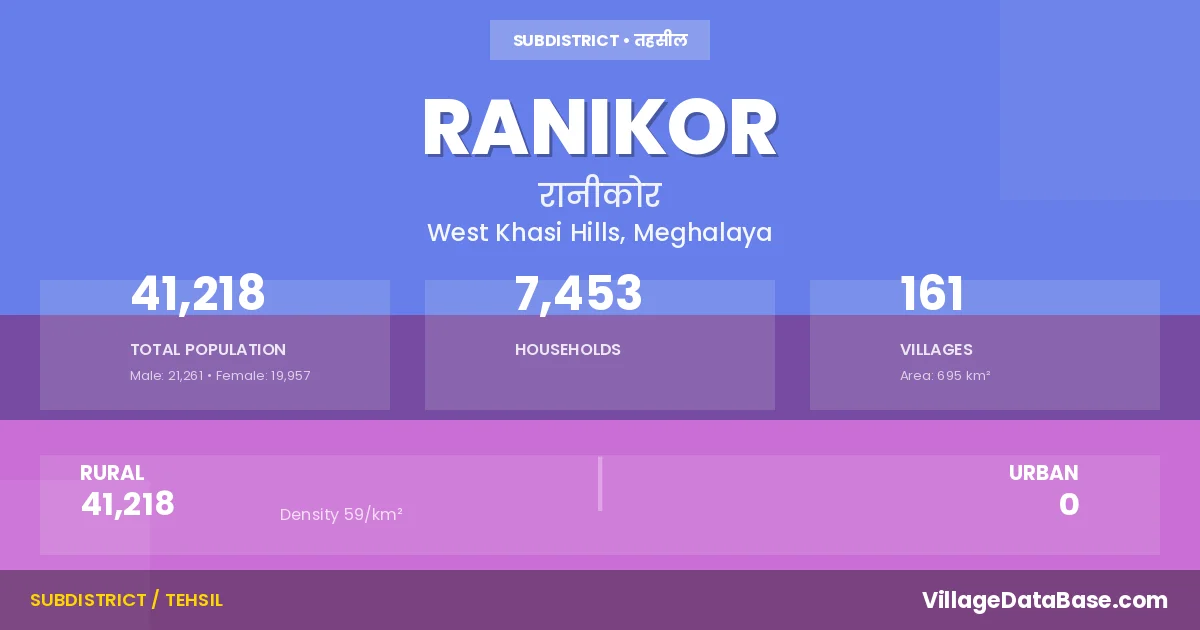 According to the 2011 census The total area of Ranikor Subdivision is 695 km², with a population of 41218 people. The population density is 59 inhabitants per square kilometre, and there are approximately 7453 houses in the sub district.